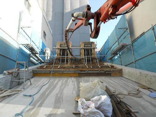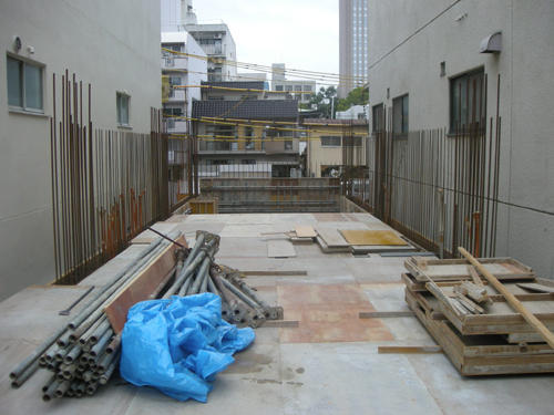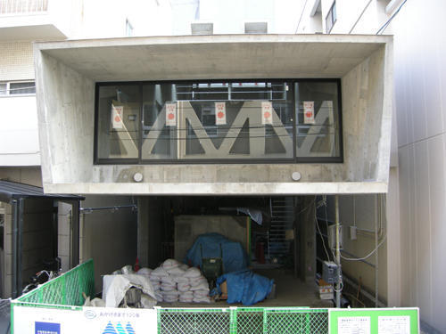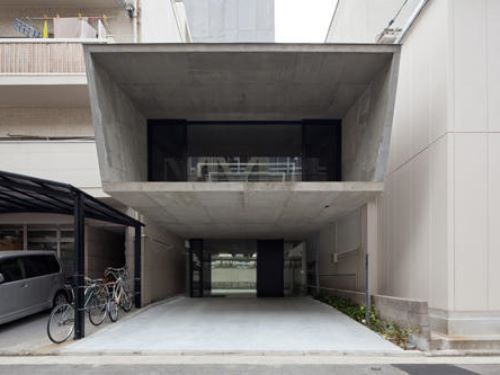 この茶室は、3層からなるRC打放し住宅の1階にある。間口3.6m、奥行き13mの平面の中央に、エントランスに底面を見せる格好で横たわる直方体。「1階を内に取り込んだ庭に、2階へのアプローチは、路地の見立てです」と、古本。